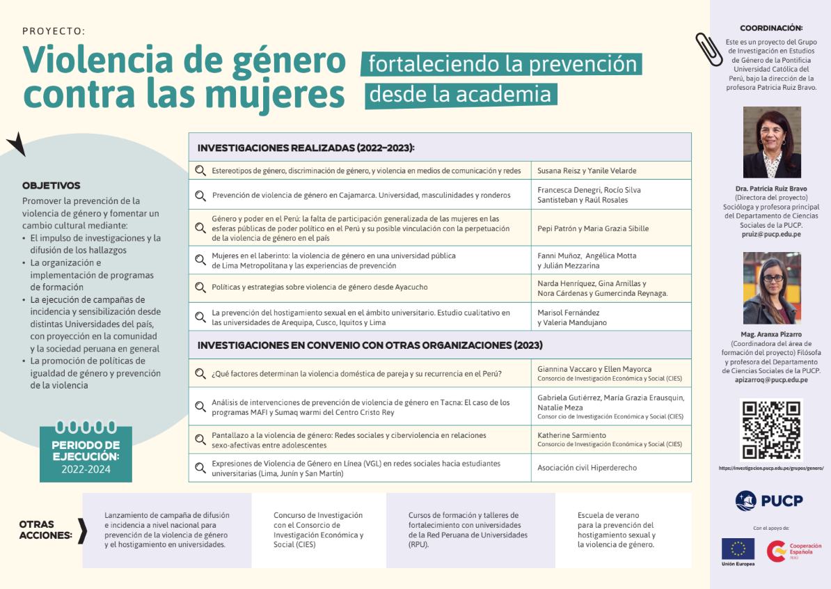 «Violencia de género contra las mujeres: fortaleciendo la prevención desde la academia» es un proyecto del Grupo de Investigación en Estudios de Género de la Pontificia Universidad Católica del Perú, bajo la dirección de la profesora Patricia Ruiz Bravo.