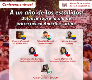La conferencia virtual busca ser un espacio de reflexión y análisis crítico, desde las Ciencias Sociales, sobre la ola de protestas ocurridas en América Latina a finales del año 2019. El panel está compuesto por cinco ponentes, quienes expondrán sobre casos nacionales (causas, características y efectos de los estallidos del año pasado), así como sobre las características, efectos y posibilidades de cambios del control policial de las protestas.
