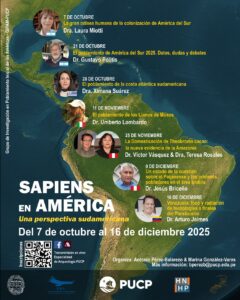 El Grupo de Investigación en el Poblamiento Inicial de las Américas (GIPAM-PUCP) se complace en anunciar el inicio de la segunda edición del ciclo de conferencias “Sapiens en América: Una Perspectiva Sudamericana”, que se desarrollará entre el 7 de octubre y el 16 de diciembre de 2025, en modalidad virtual y con transmisión en vivo a través de la página de Facebook de Arqueología PUCP: https://www.facebook.com/ArqueologiaPUCP.