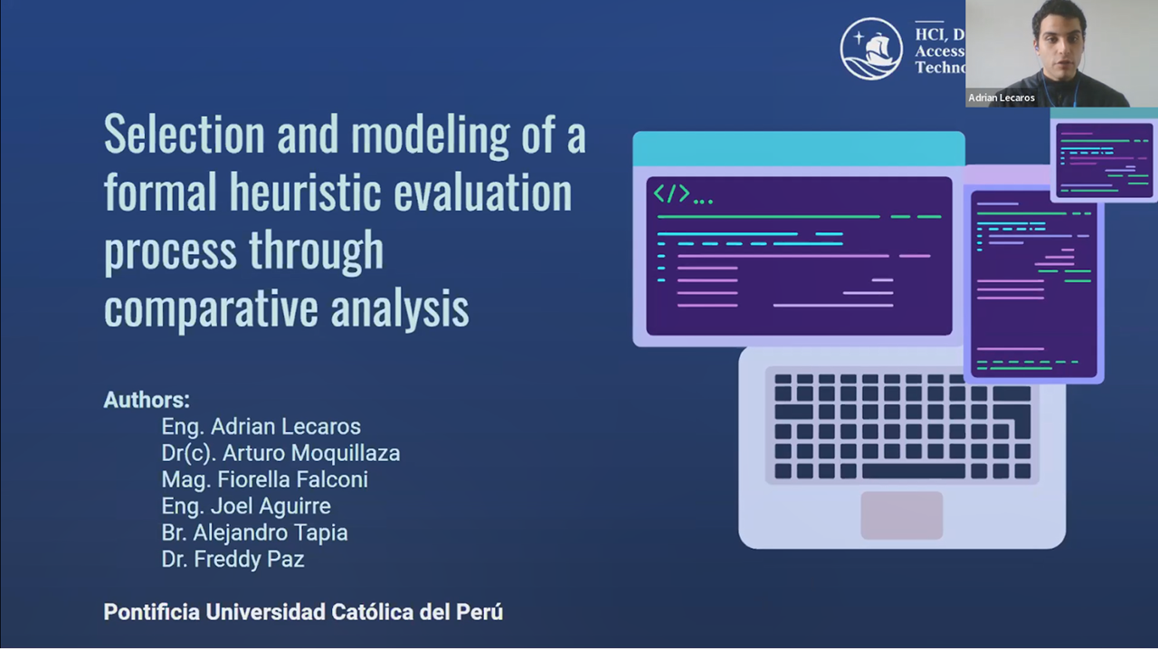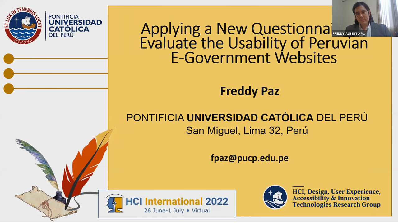 Felicitamos a la delegación de docentes, investigadores y estudiantes de nuestra universidad, quienes nos representaron en la 24th International Conference on Human-Computer Interaction, realizada desde Suecia en modalidad virtual. Esta delegación estuvo liderada por el Dr. Freddy Paz y conformada por miembros del grupo de investigación HCI DUXAIT de nuestra universidad. En dicho evento, celebrado entre el 24 de junio y el 1 de julio de 2022, se presentaron diversos artículos del grupo de investigación, en las líneas de proyectos de investigación, casos de estudio y proyectos de tesis que los estudiantes están llevando a cabo. Luego de concluido el evento, todos los artículos presentados han sido exitosamente publicados en la prestigiosa editorial Springer, e indizados en la base de datos Scopus.