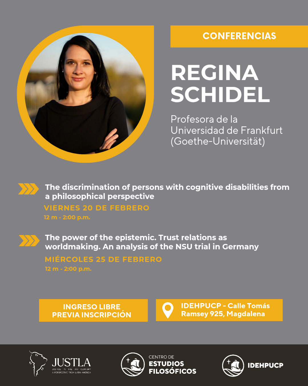 El Instituto de Democracia y Derechos Humanos de la PUCP (IDEHPUCP), el Centro de Estudios Filosóficos de la PUCP y el Consorcio “JUSTLA” (“Justice in the XXI Century: A Perspective from Latin America”) organizan las conferencias que ofrecerá la filósofa Regina Schidel, profesora de la Universidad de Frankfurt (Goethe-Universität), cuyas investigaciones abordan problemáticas de derechos humanos y discapacidad, la confianza social, la epistemología feminista y política, y las teorías de la injusticia epistémica.