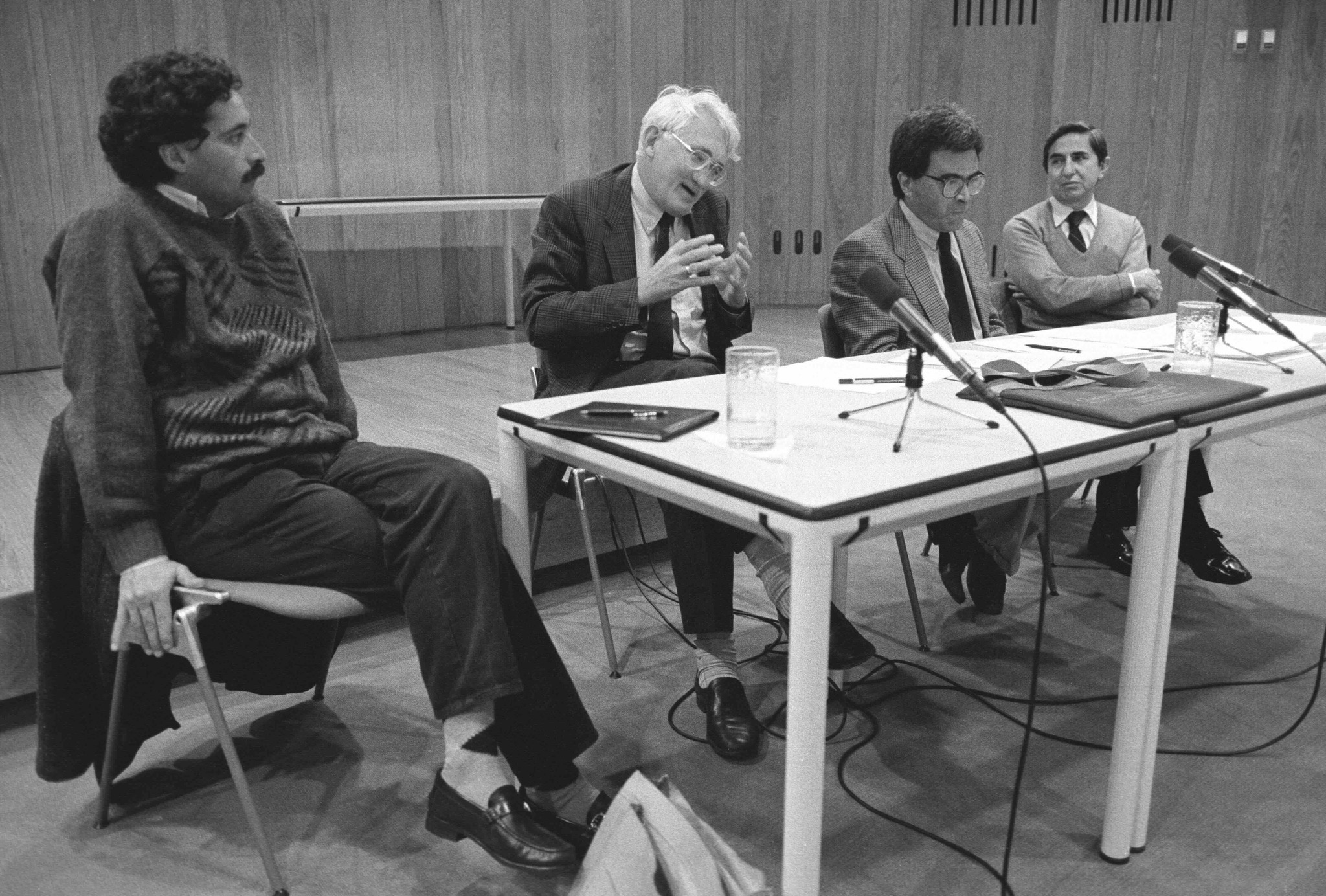 Foto de la visita de Habermas al Perú, en 1989. De izquierda a derecha: Miguel Giusti, Jürgen Habermas, Carlos B. Gutiérrez y David Sobrevilla. Créditos: Fernando Castro.