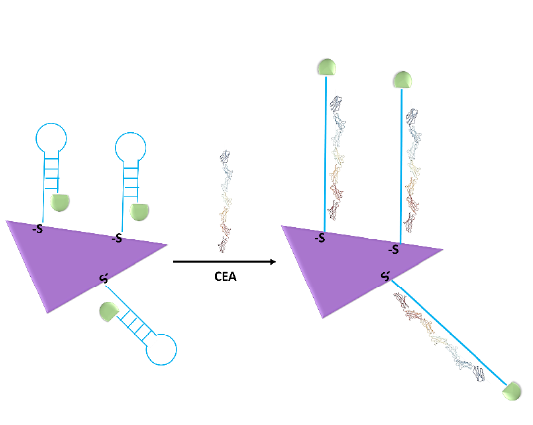 El antígeno carcinoembriogénico (CEA) es un potente marcador tumoral de distintos tipos de cáncer como el colorrectal y el pancreático, que además está involucrado en procesos metastásicos. Así, se cree que su temprana detección e inclusión en pruebas rutinarias, puede ser un pilar básico para disminuir la tasa de mortalidad de estos tipos cáncer hasta en un 30%. En este proyecto se pretende implementar nuestros conocimientos adquiridos en la preparación de nanoaptasensores, en el desarrollo de un sistema basado en nanopartículas de oro y aptámeros-horquilla (apt-HO) para la detección del marcador tumoral CEA de manera rápida y sencilla. El uso de nanotriángulos funcionalizados con un apt-HO biotinilado (AuNT@apt-HO-biot) permite el desarrollo de un sistema dual, ya que en presencia de CEA, el cambio conformacional experimentado por el aptámero puede ser monitoreado mediante dos técnicas analíticas accesibles y portátiles como son la espectroscopía UV-Vis-NIR y la espectroscopía Raman amplificada en superficie (SERS), proporcionando mayores señales que los aptámeros convencionales. Para mejorar aún más los límites de detección de este sistema, se va a introducir un elemento extra de amplificación, nanoesferas de oro modificadas con estreptavidina (AuNS@tiop-strept). Así, únicamente en presencia de CEA y tras el cambio conformacional experimentado por el aptámero, la biotina terminal del mismo queda expuesta y es reconocida por la AuNS@tiop-strept, que debido a su pequeño tamaño pueden unirse con un bajo impedimento estérico cual piezas de un rompecabezas. Este acoplamiento permite amplificar de manera sencilla y directa las señales del sensor, no sólo mediante la aparición de una nueva banda plasmónica perteneciente a las AuNS, sino permitiendo que la interacción biot-strept también sea monitoreada, ya que dicha unión se produce únicamente en presencia de CEA y, por tanto, su magnitud está directamente relacionada con la concentración de este último.